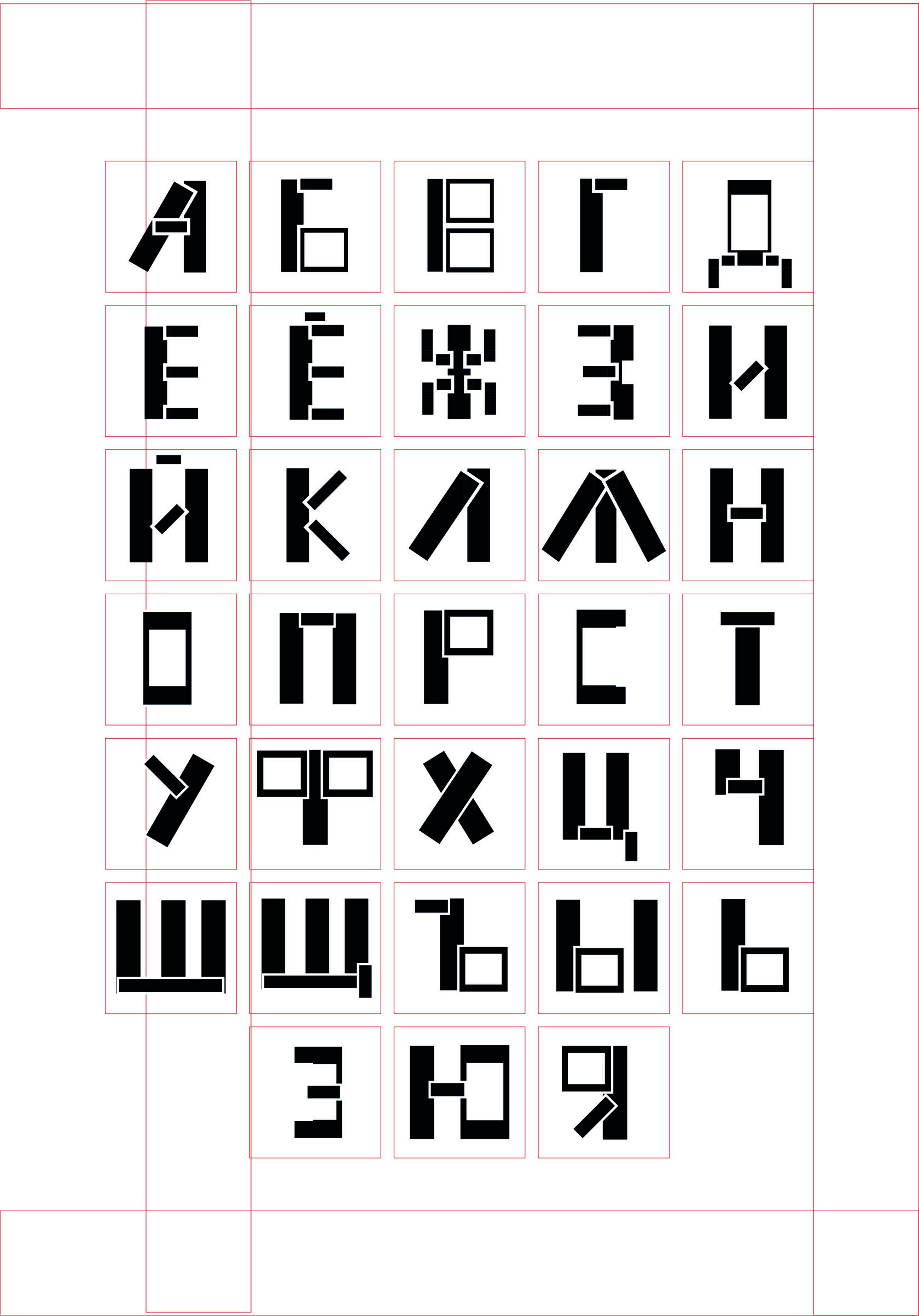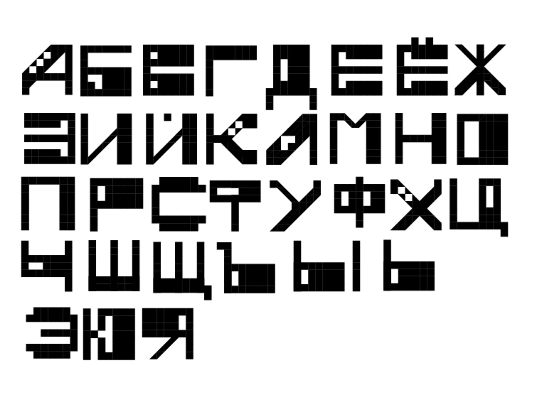 Шрифт гротескный, узкий, с наклонными в лево А и Л. W, V, Ф, Ж, Д, М, Э сильно шире остальных букв.