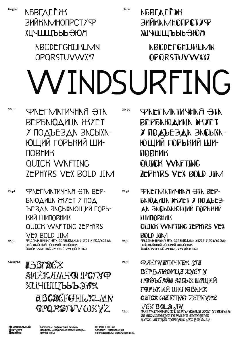 Регулярное начертание и декоративное. Шрифт основан на советских шрифтах. Название Windsurfing было выбрано на основе буквы Ф, которая в этом шрифте похожа на парус.
